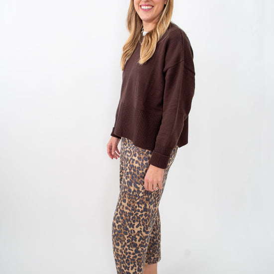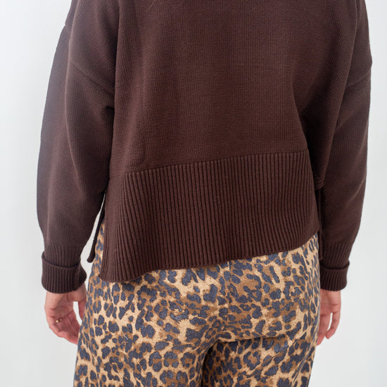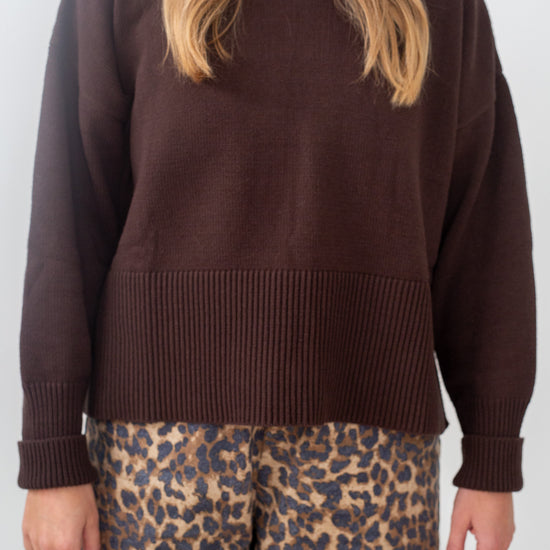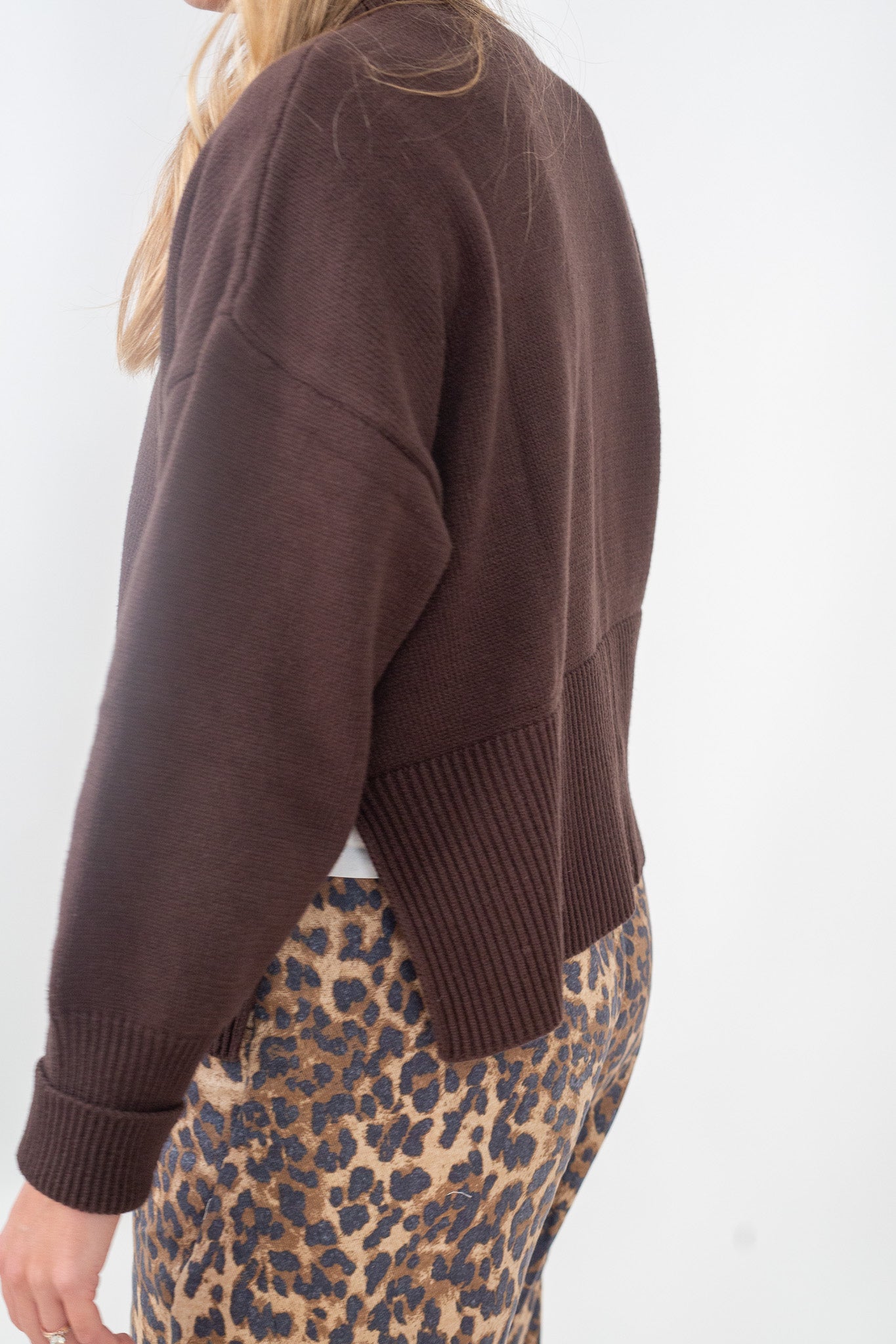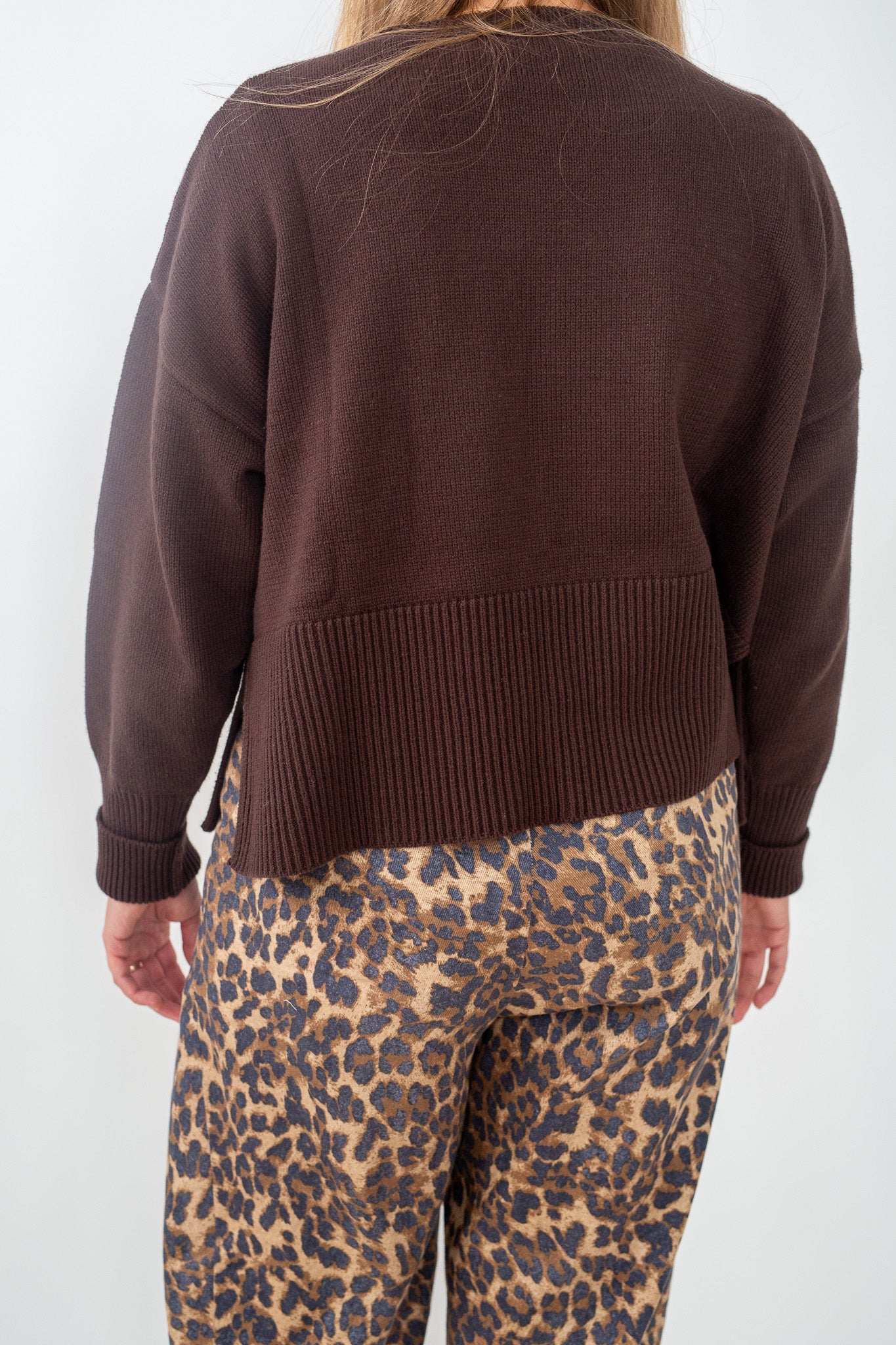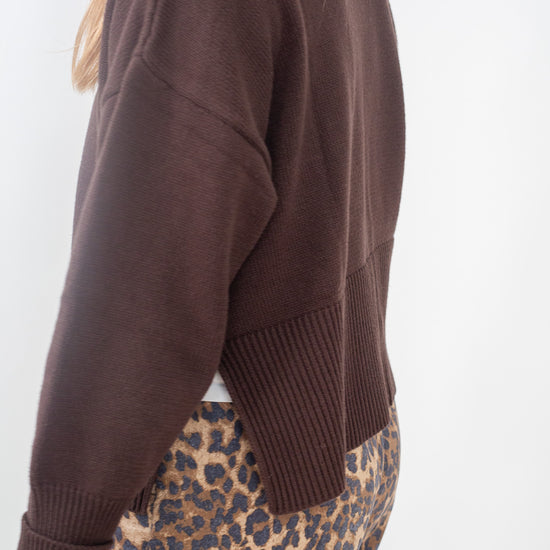 Cozy medium weight brown sweater with a boxy and slightly cropped fit. Side slit gives the sweater a nice drape.