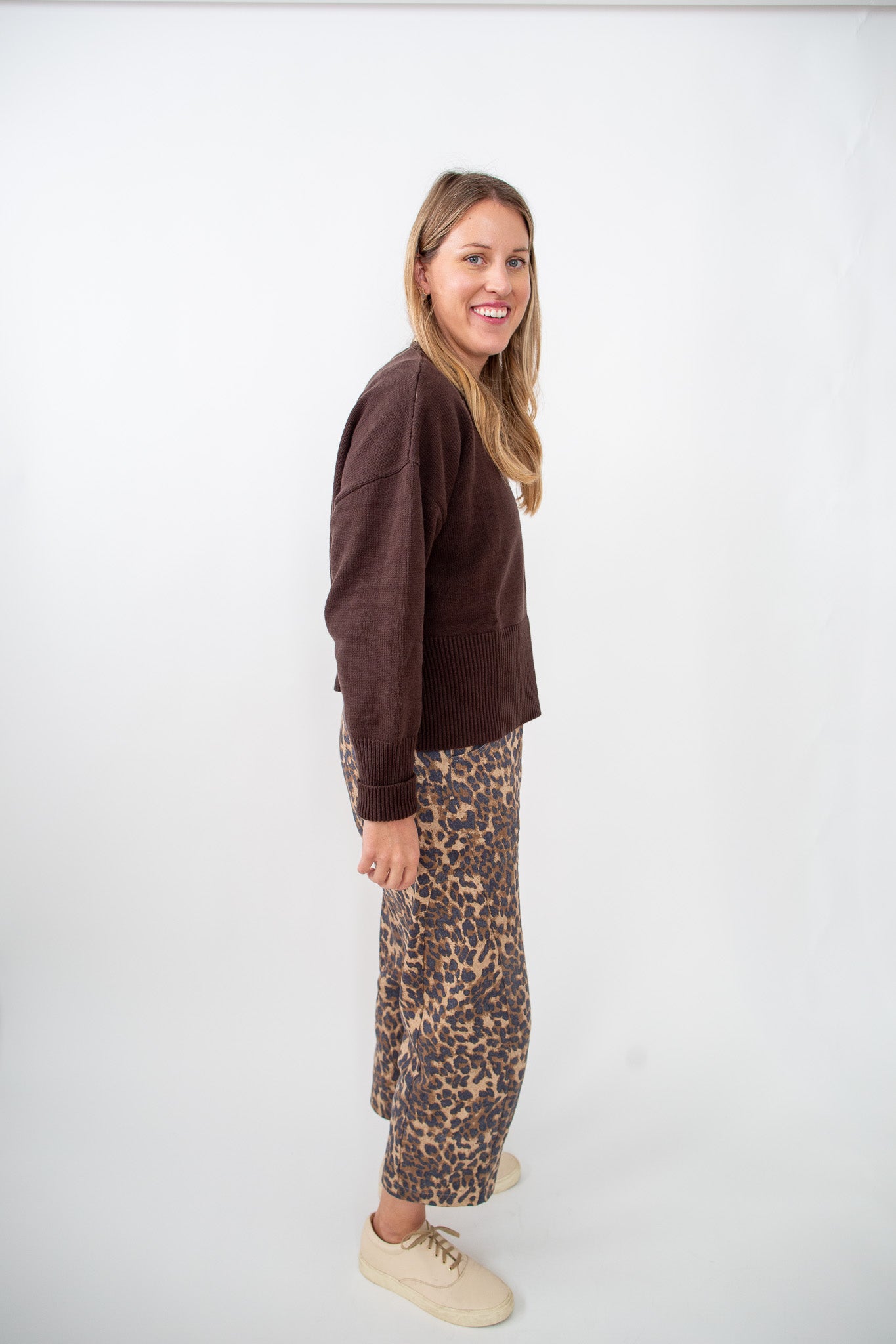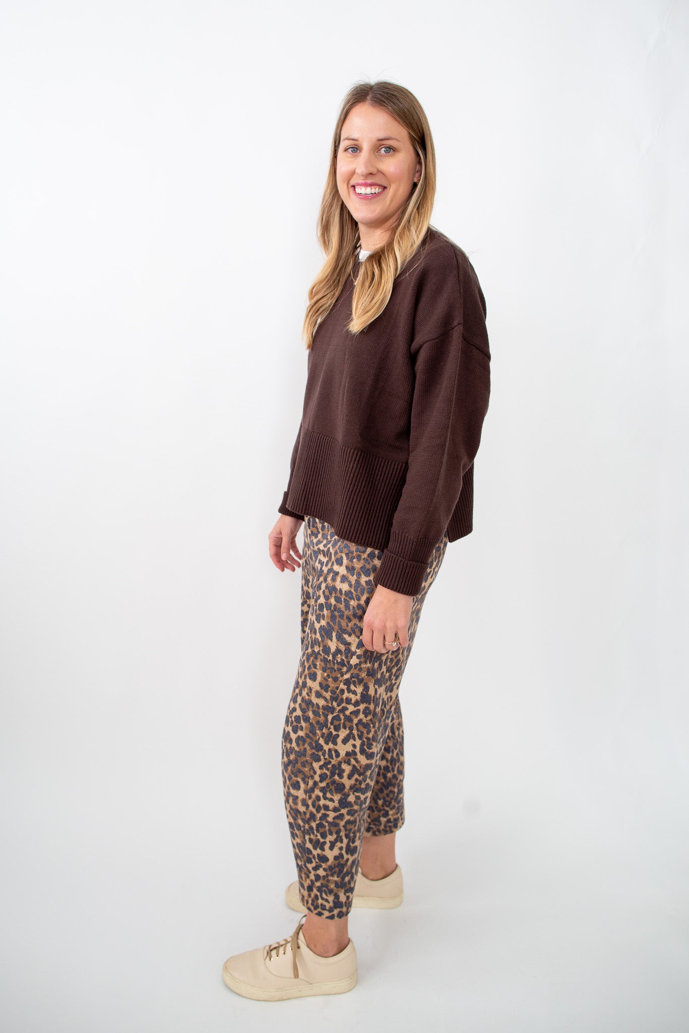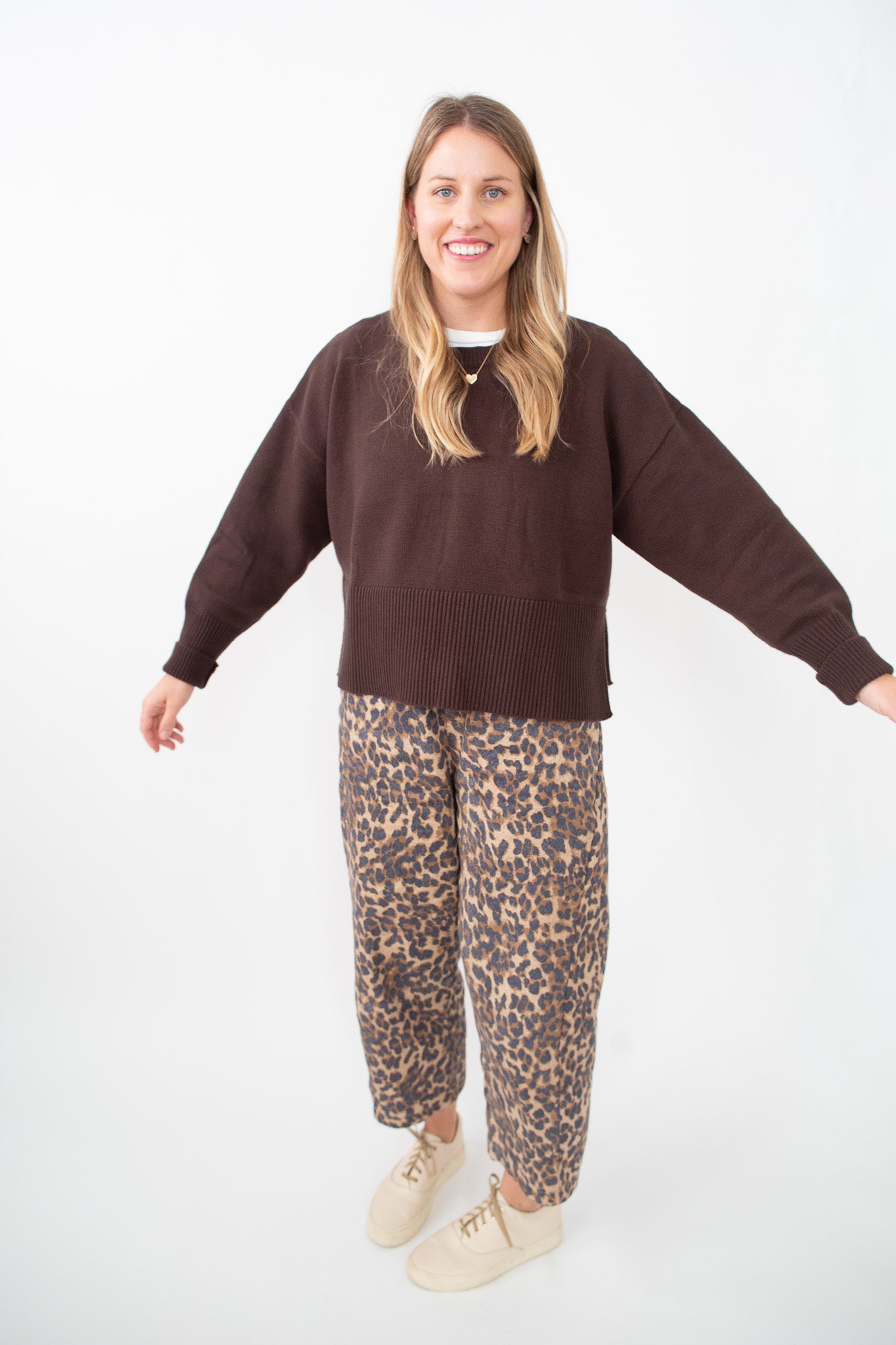 Cozy medium weight brown sweater with a boxy and slightly cropped fit. Side slit gives the sweater a nice drape.