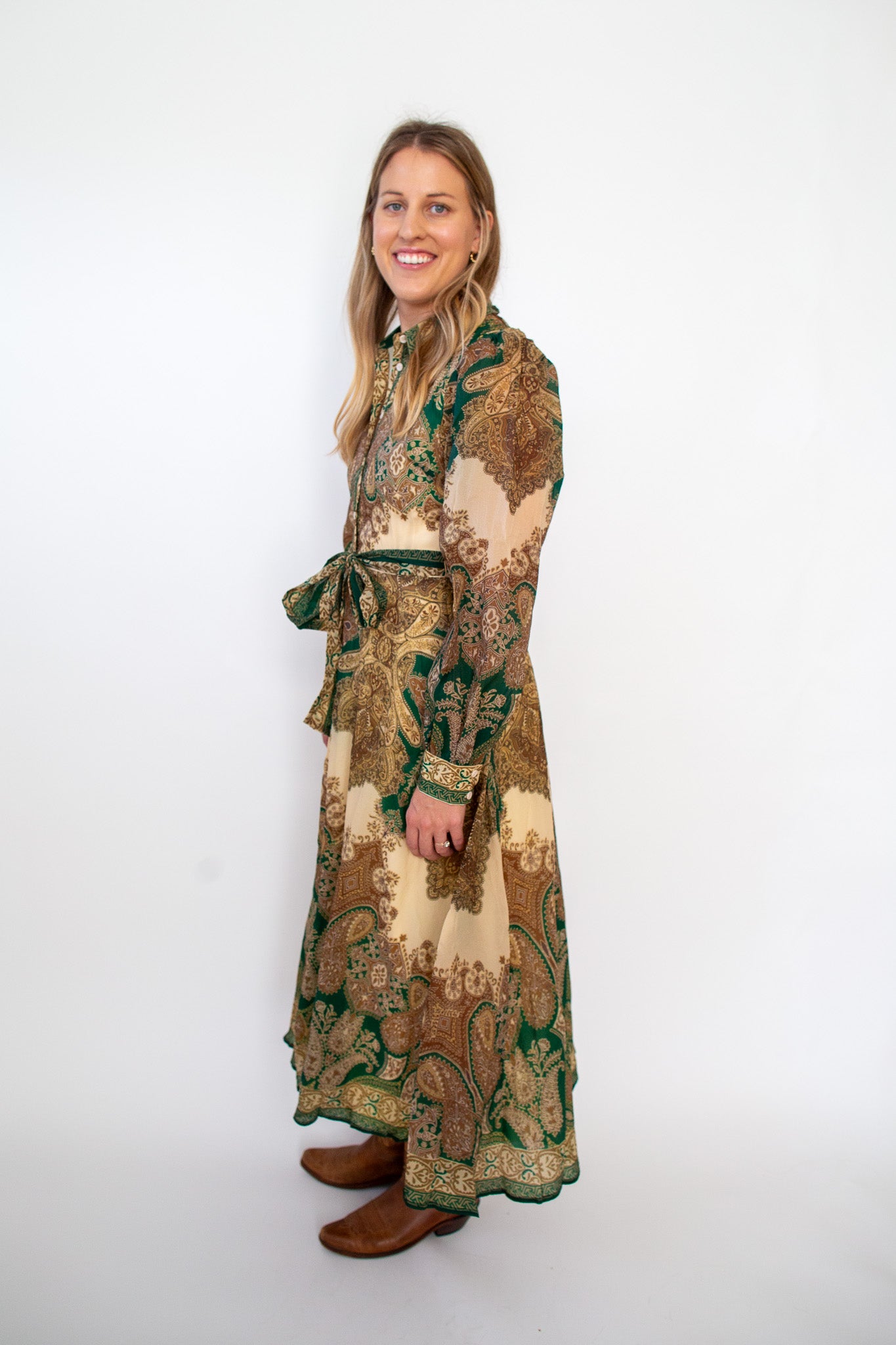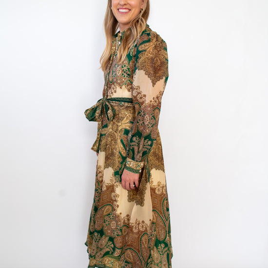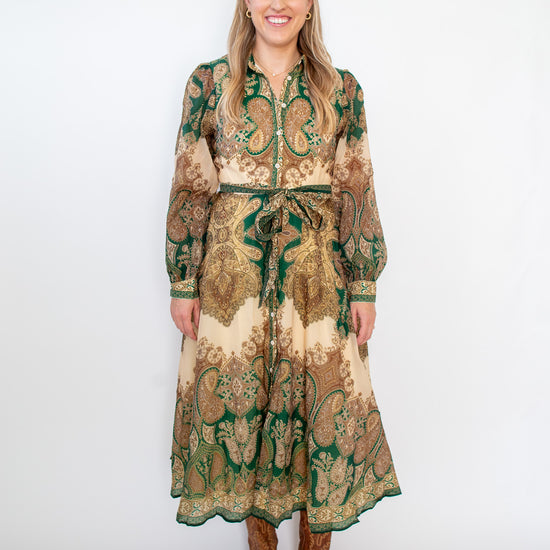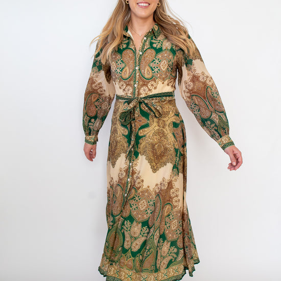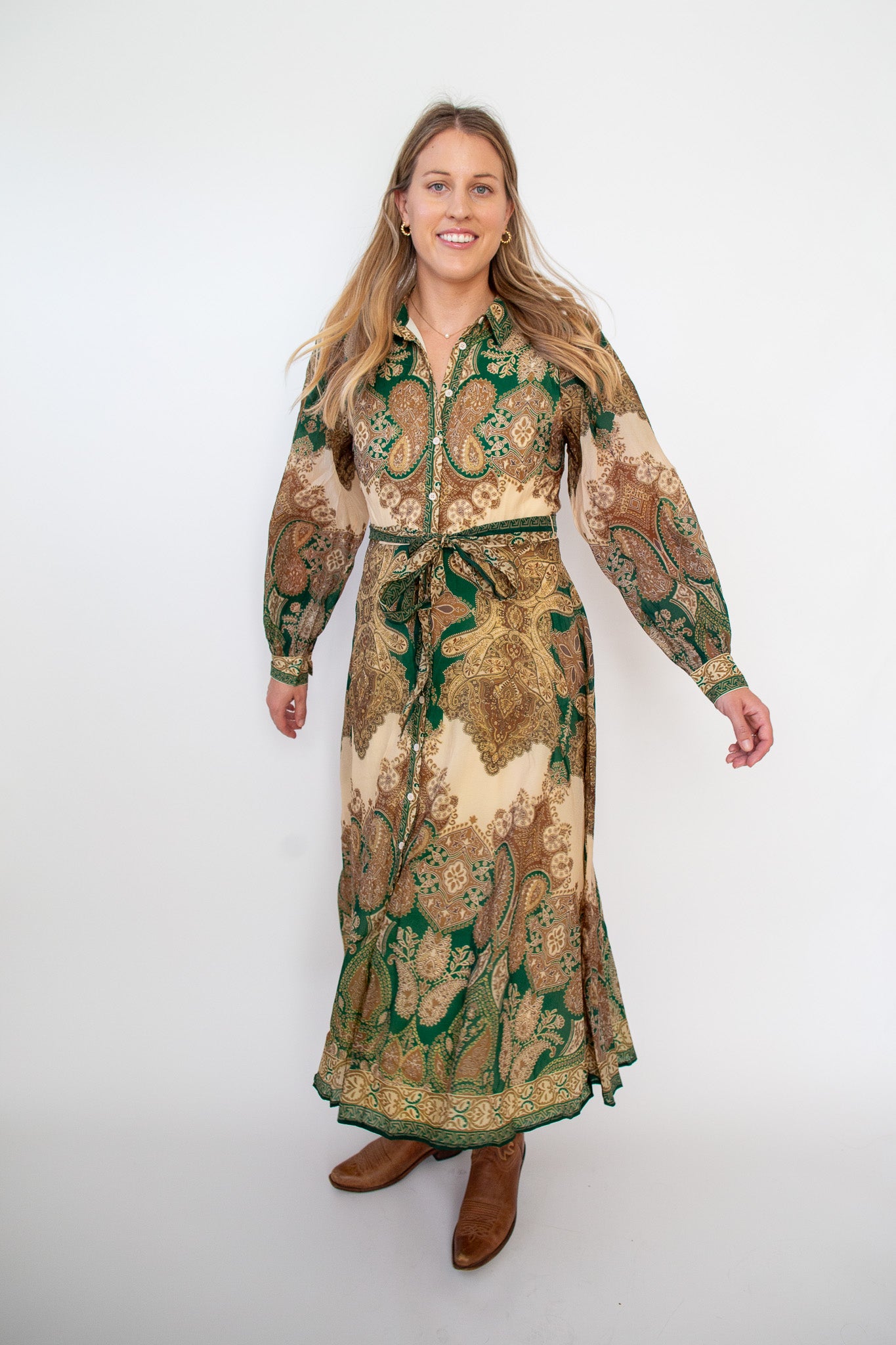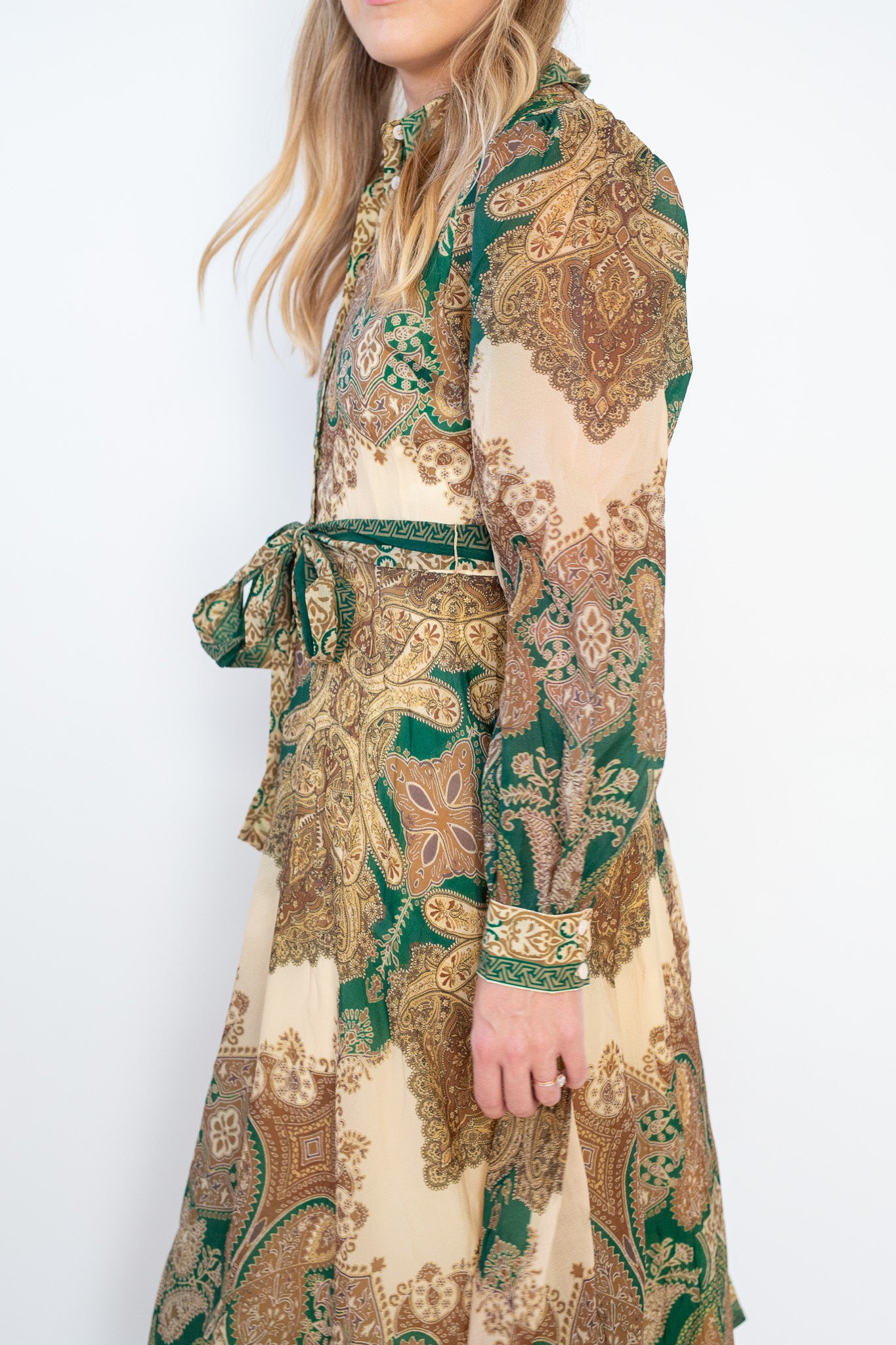 A printed woven midi dress featuring a collar, front button down closure, waist tie, long sleeve with cuff and circle skirt
