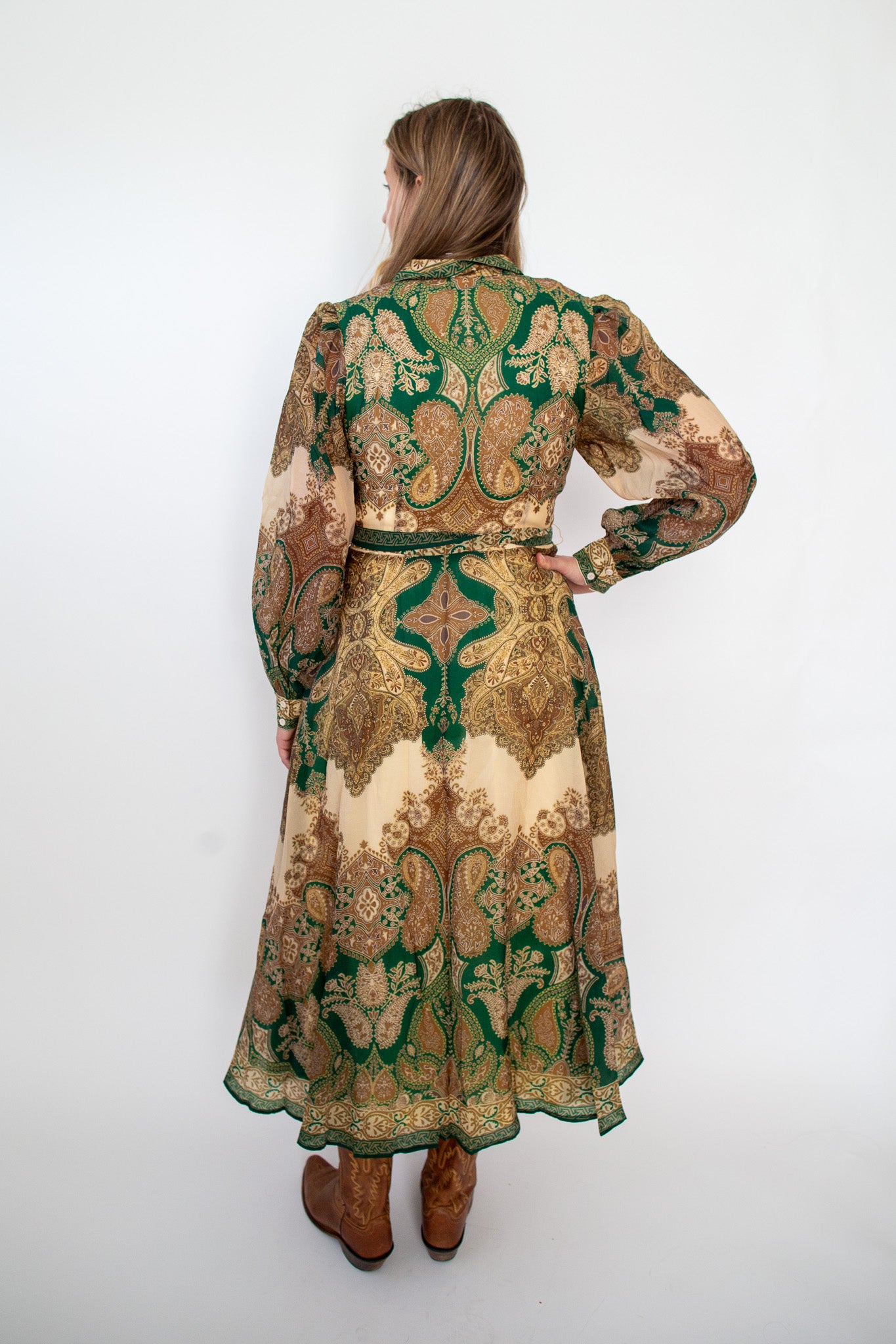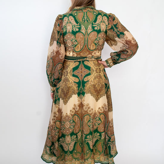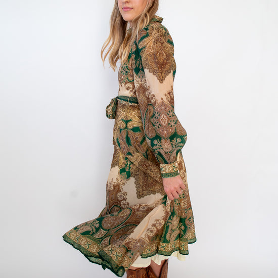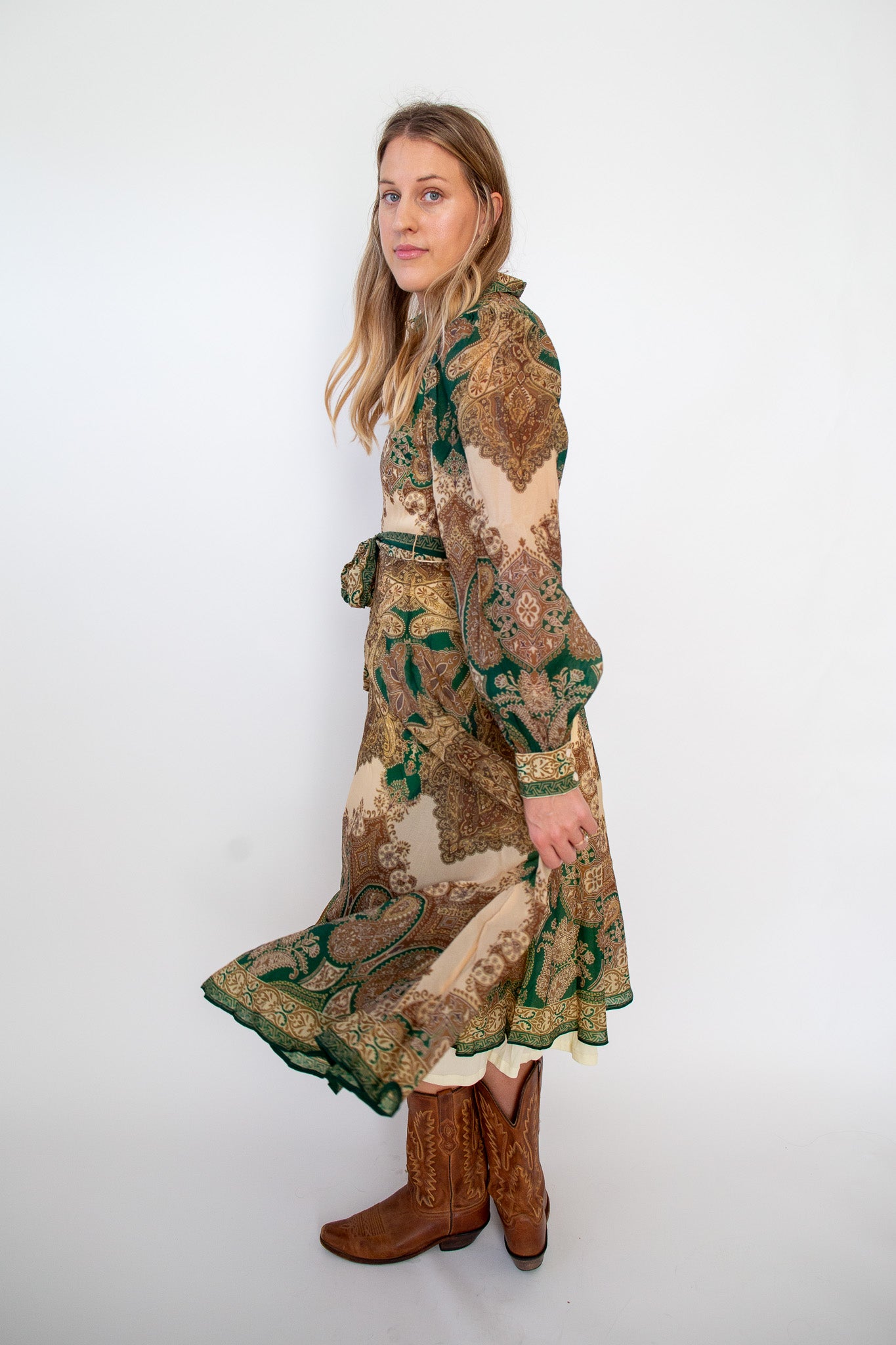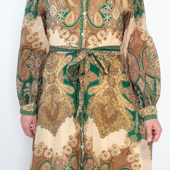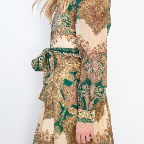 A printed woven midi dress featuring a collar, front button down closure, waist tie, long sleeve with cuff and circle skirt