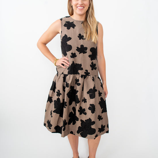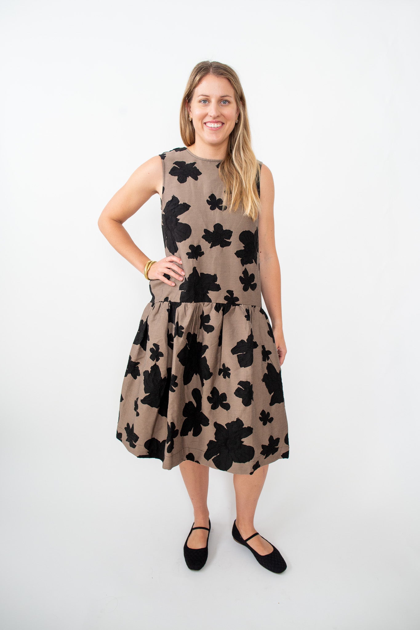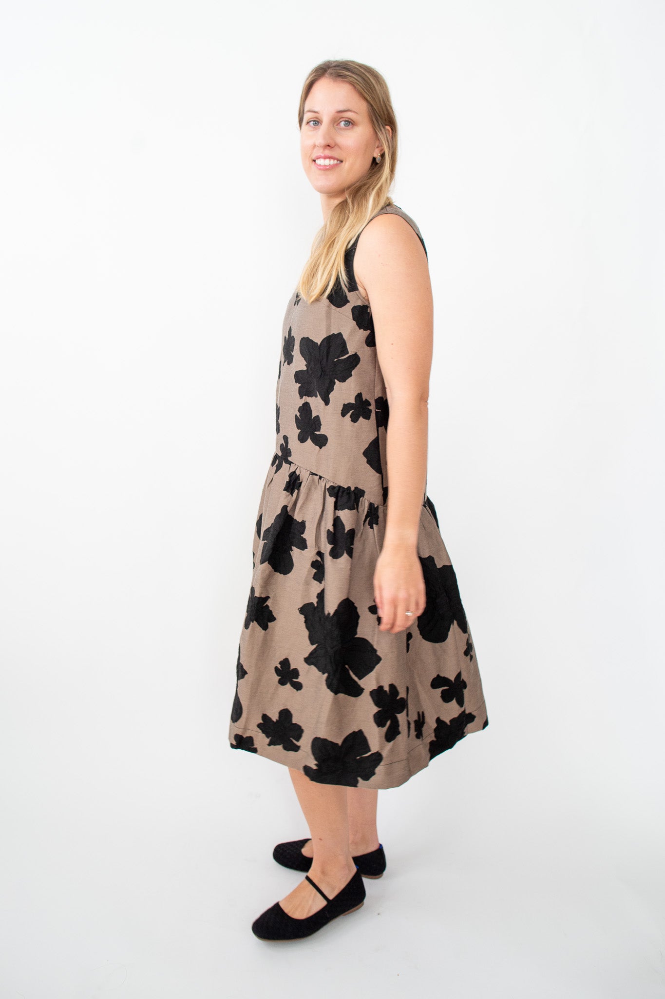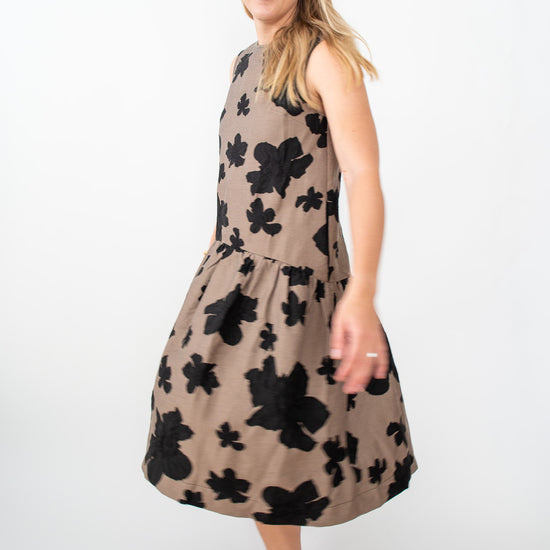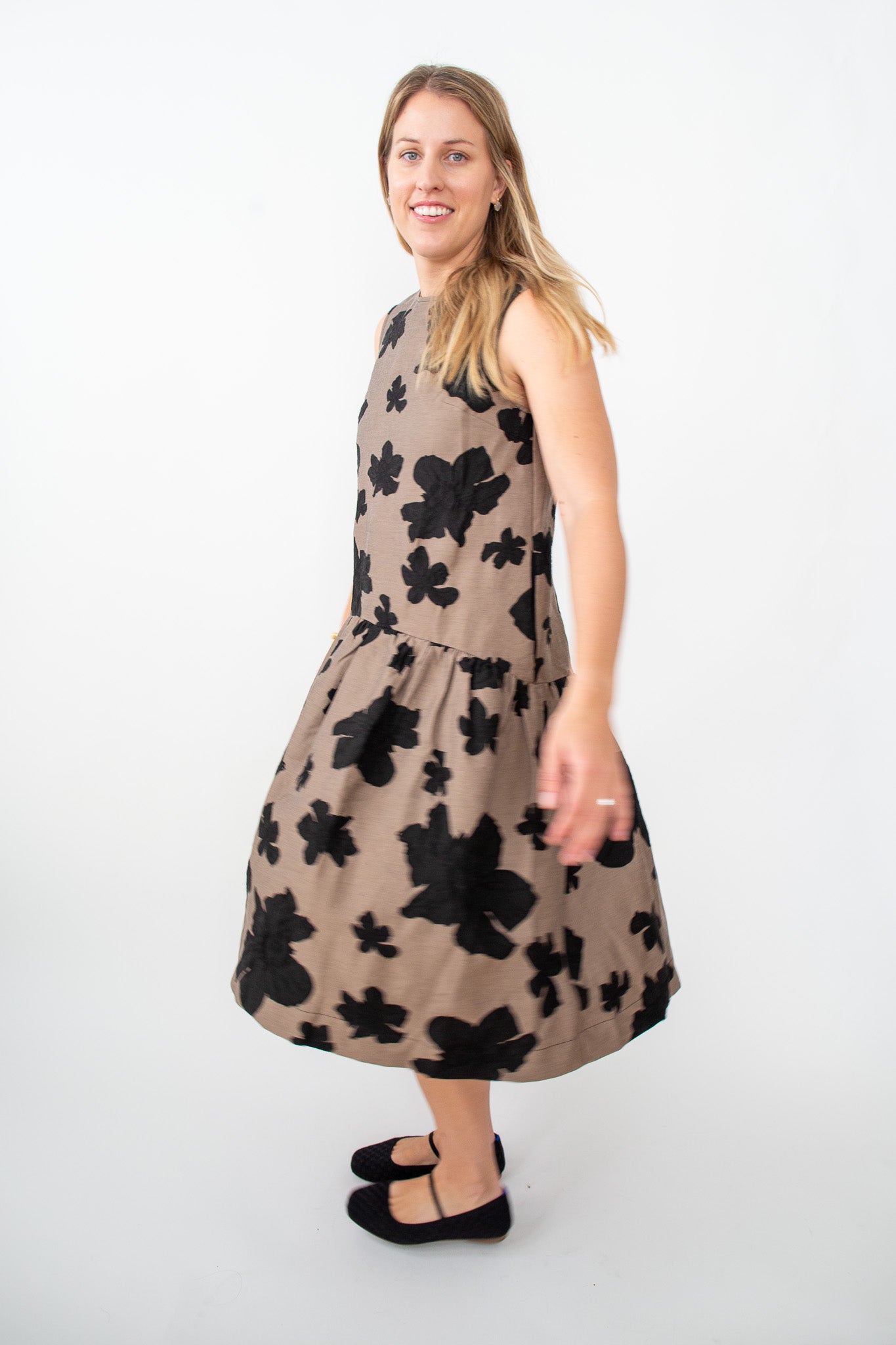 Gorgeous jacquard fabric with an all over 3D floral design. Curved drop waist. Back zipper closure. And pockets!