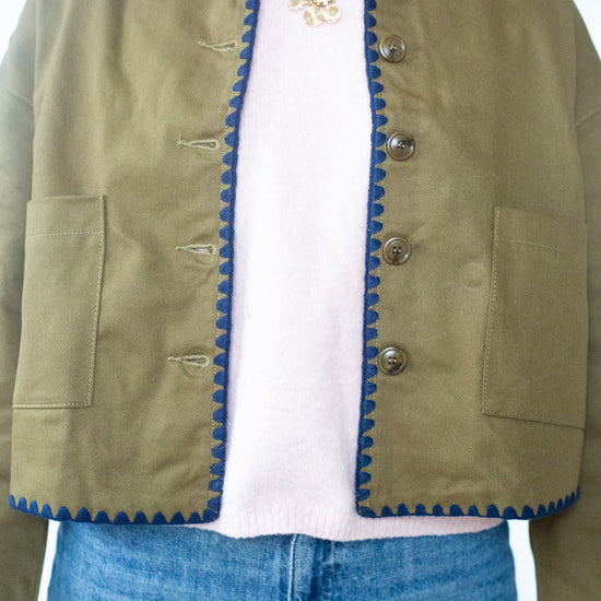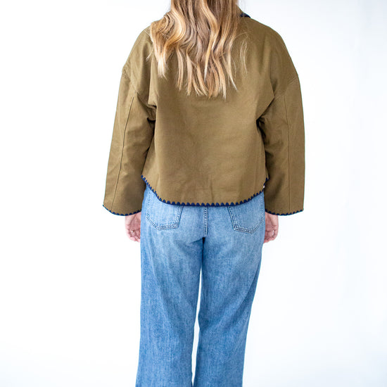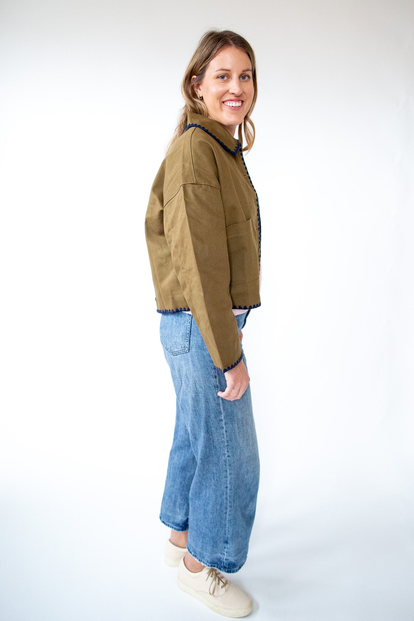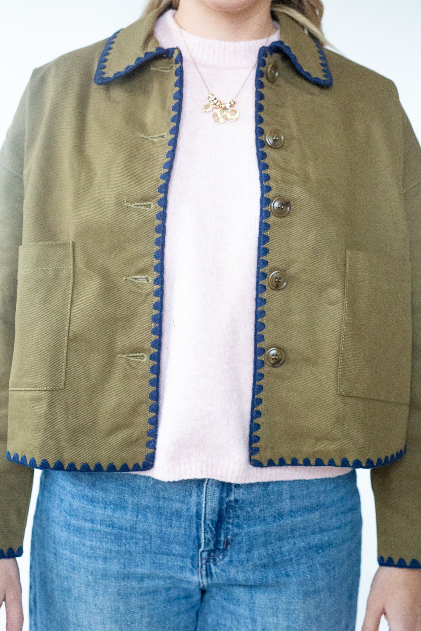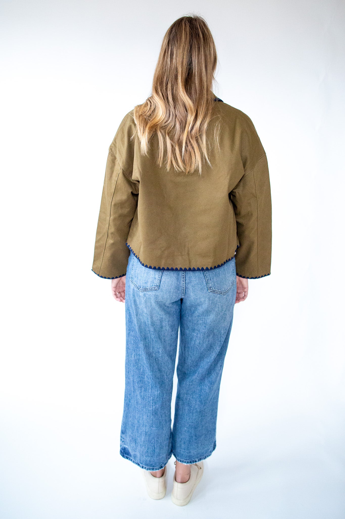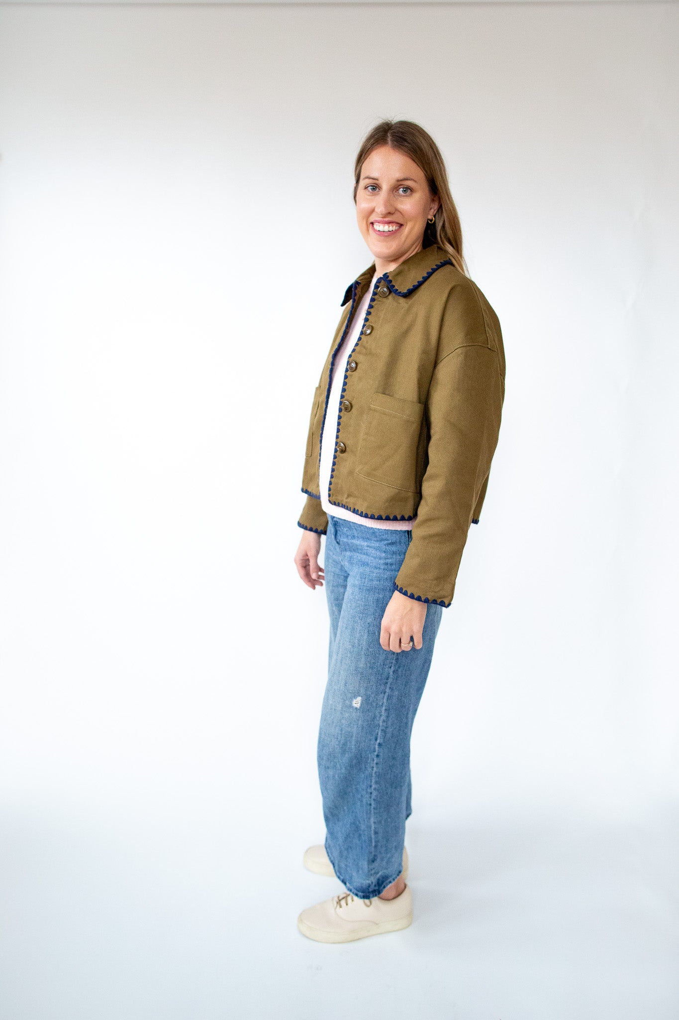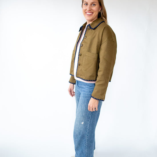 A playful twist on a classic silhouette, this boxy-fit jacket features bold contrast whipstitch trim along the collar, placket, cuffs, and hem. Designed with a clean, structured shape, patch pockets, and full lining for added comfort and warmth. Perfect for layering over your everyday looks with a touch of personality.