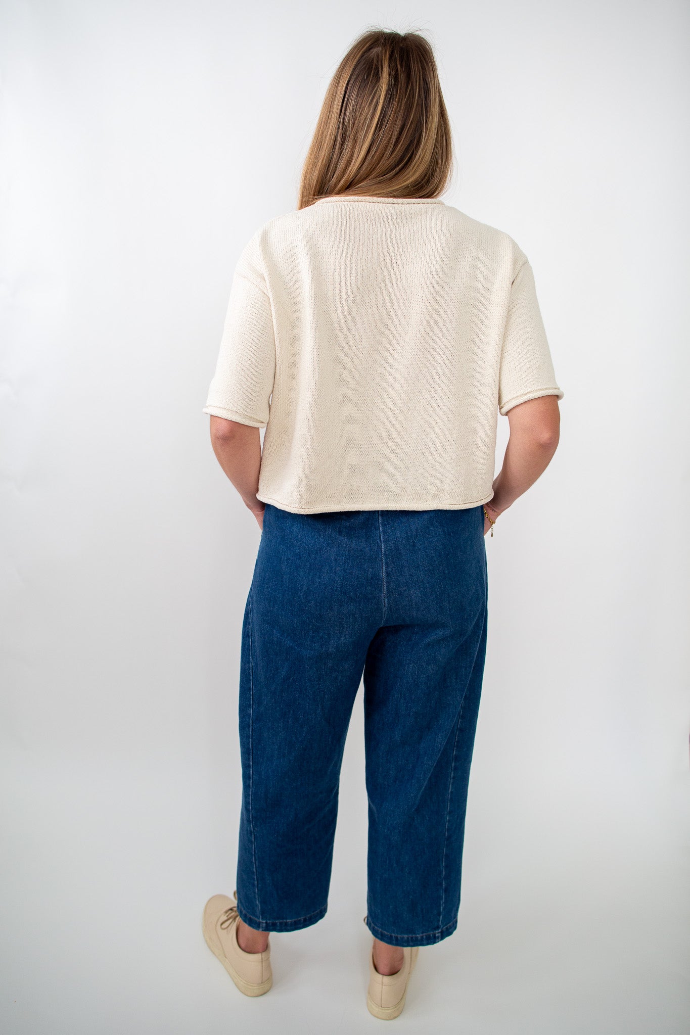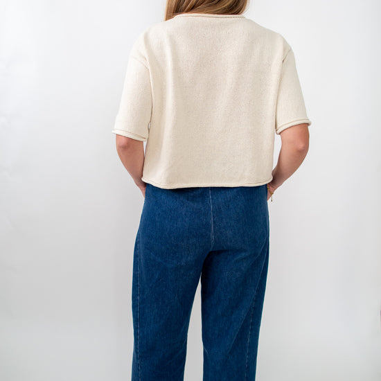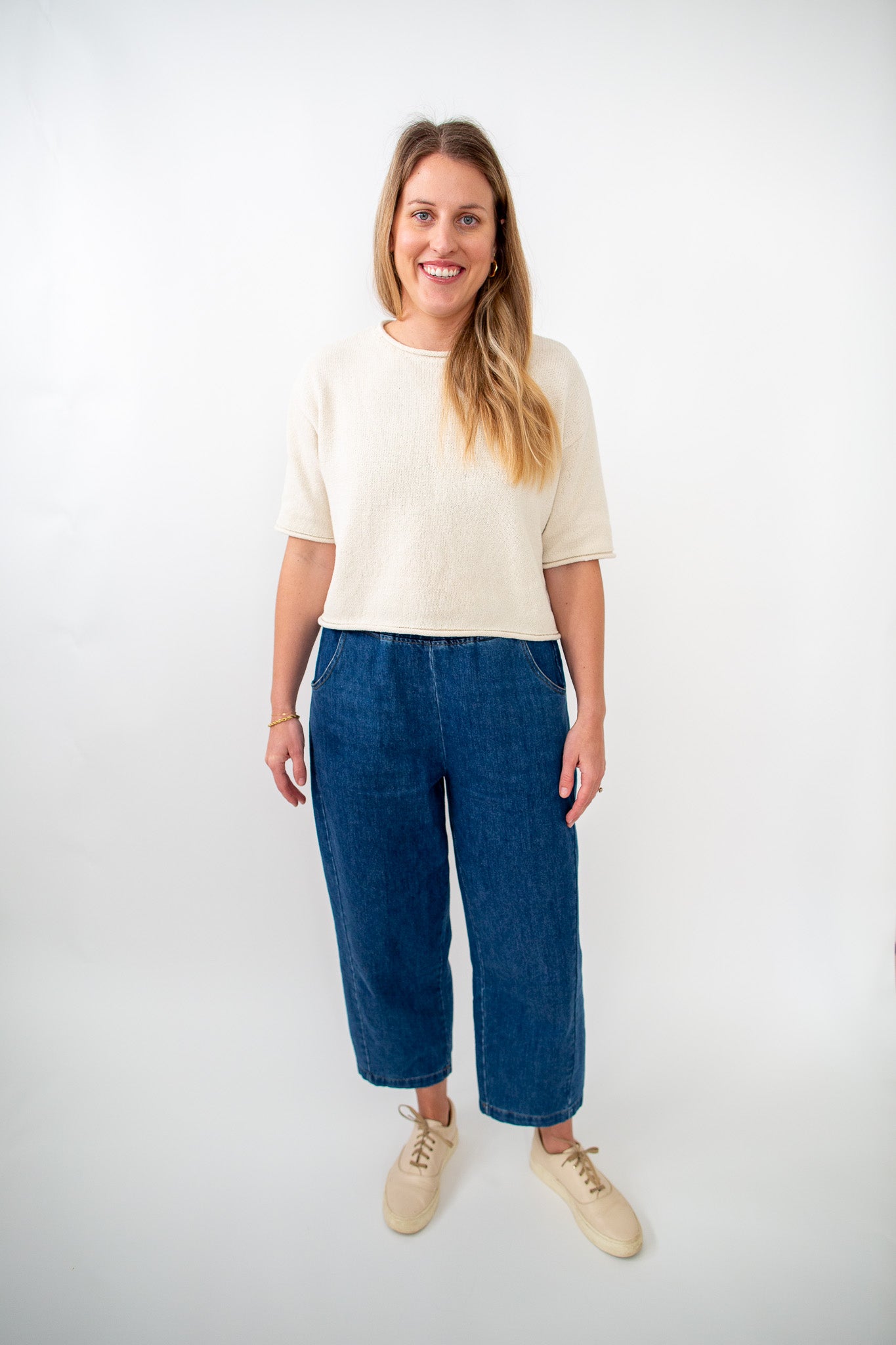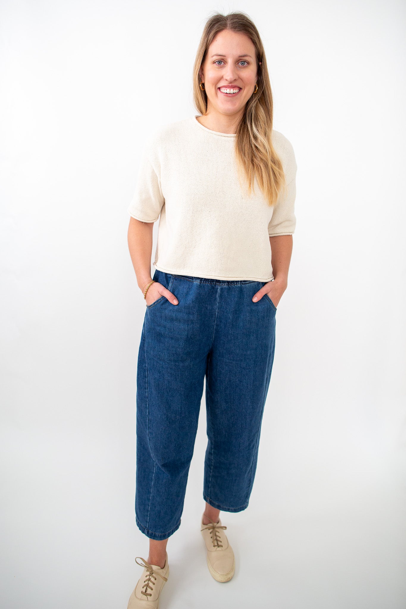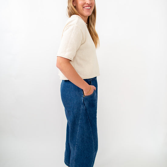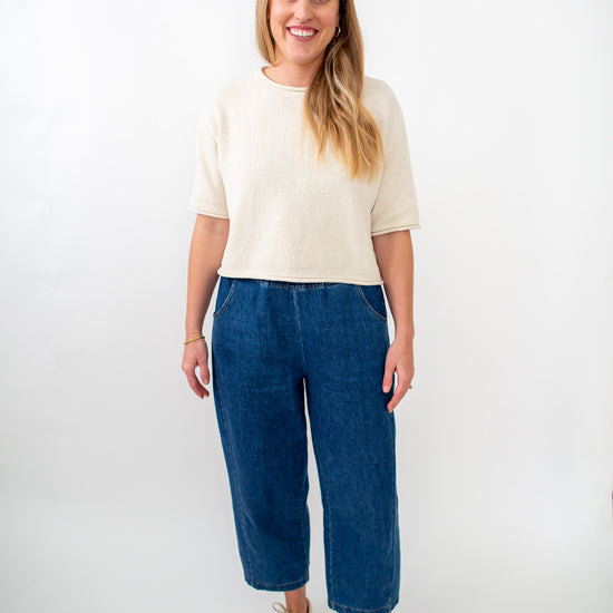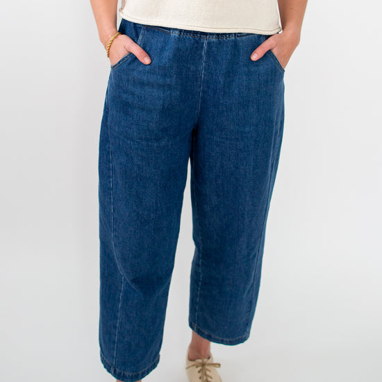 Our Audrey Denim Pants feature a stretchy waistband and a relaxed fit. They are high wasted, dark wash denim, with side pockets.
