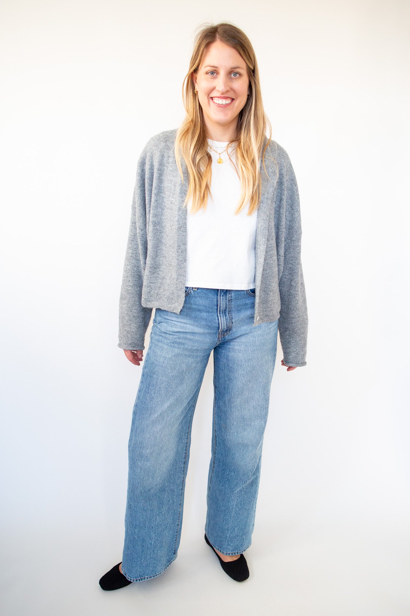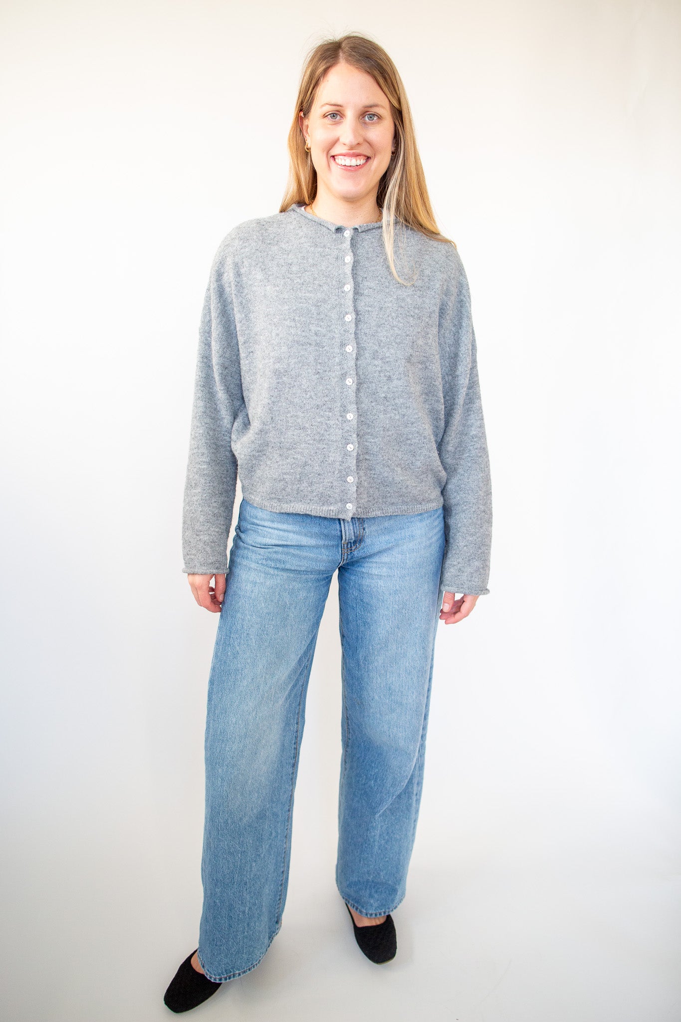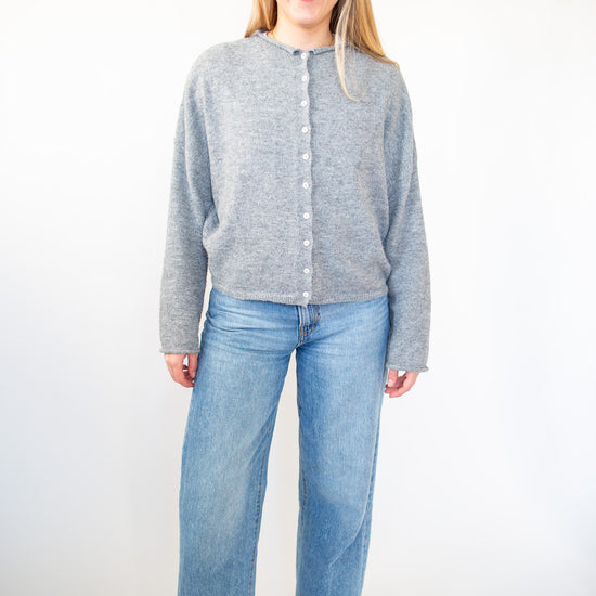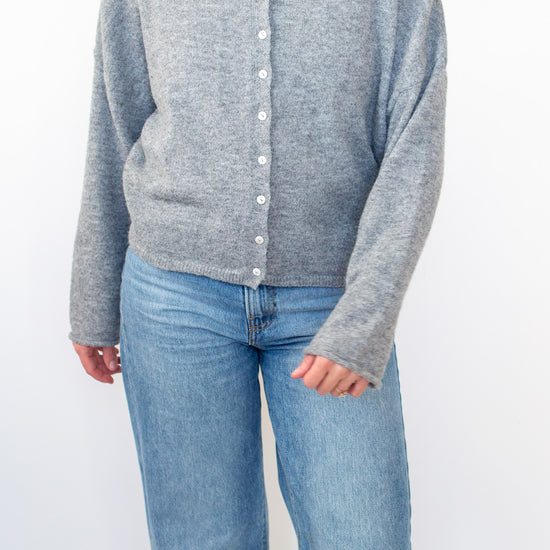 Soft and cozy lightweight cardigan with rolled edge finish on the sleeves and collar.