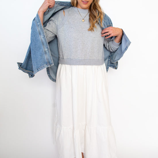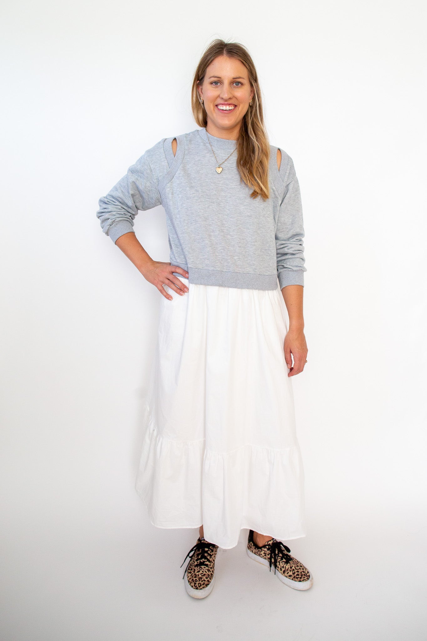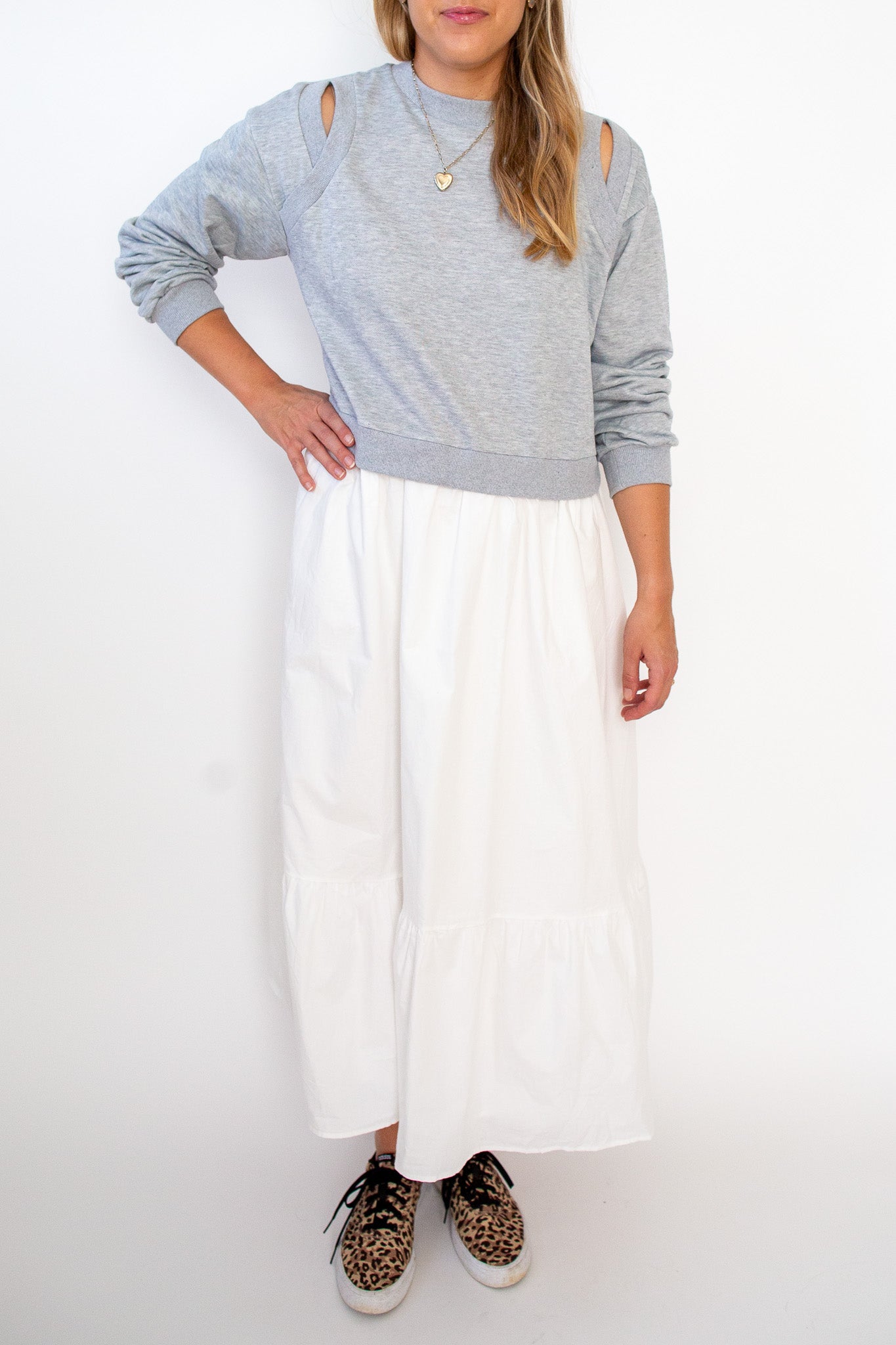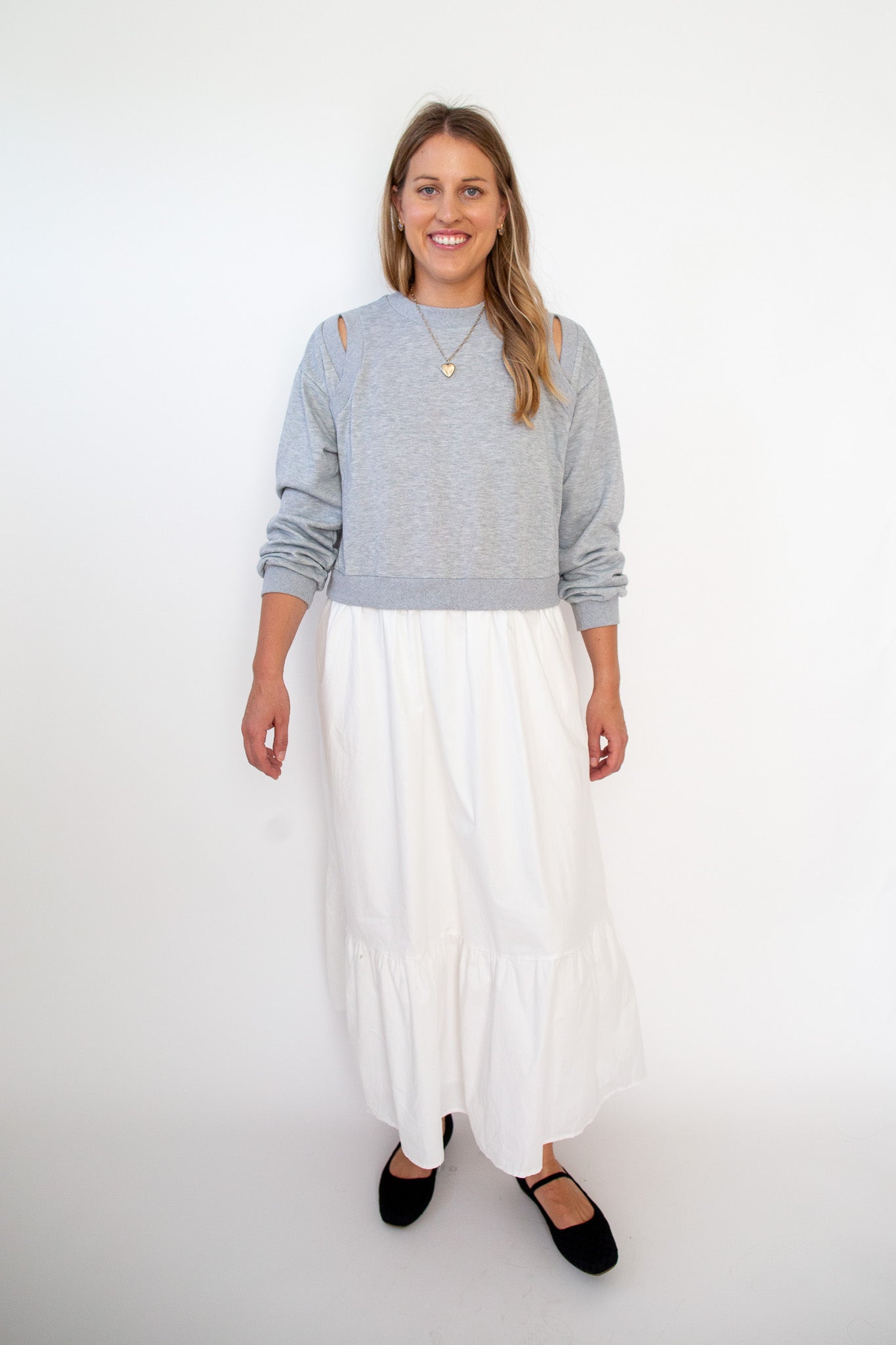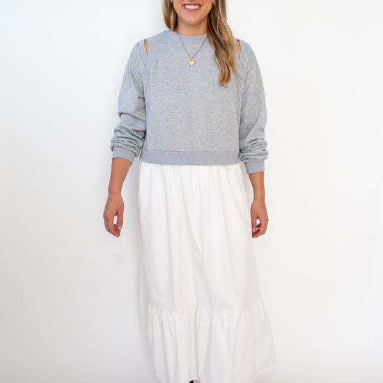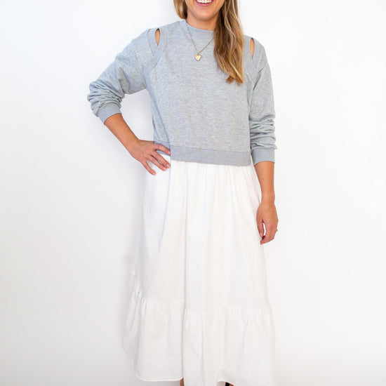 The cut-out shoulder sweatshirt mix maxi dress blends comfort and style effortlessly. Featuring a relaxed sweatshirt top with trendy cut-out shoulder details, it transitions into a flowing maxi skirt, creating a unique, fashion-forward look.