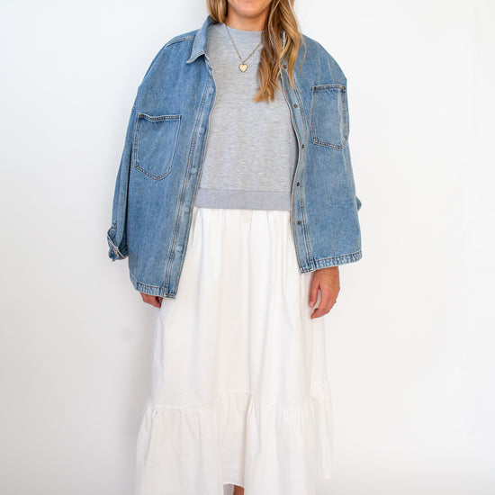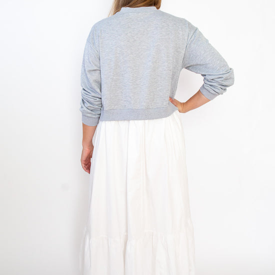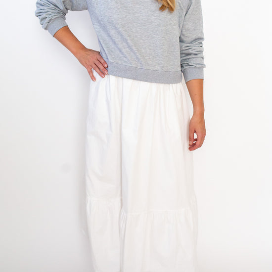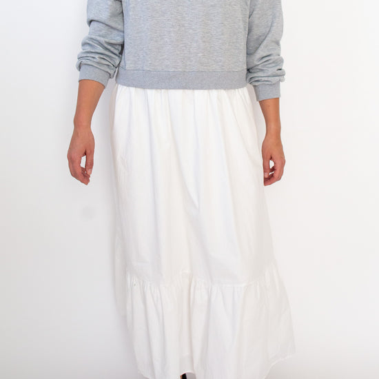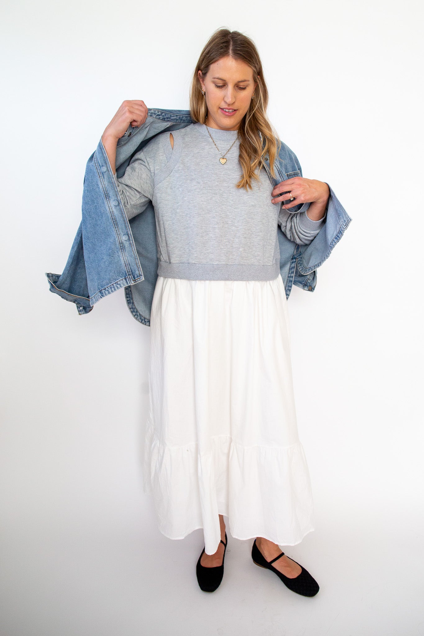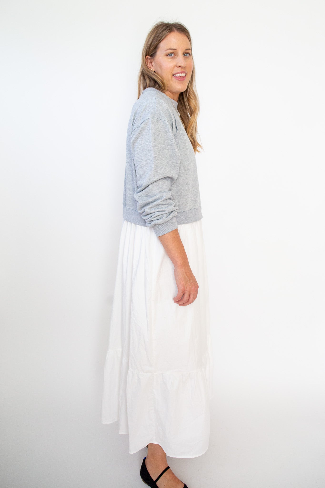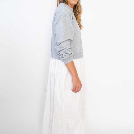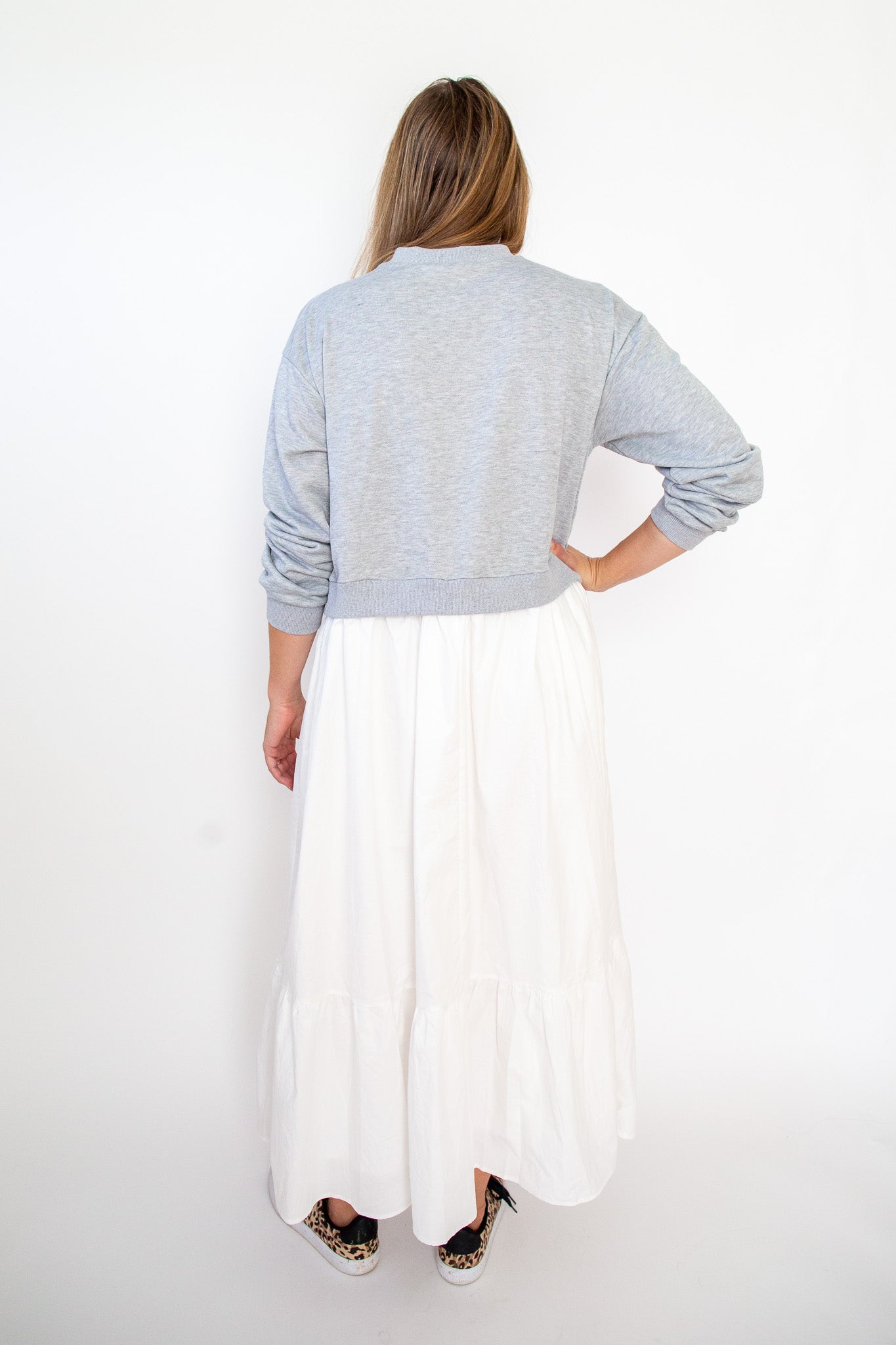 The cut-out shoulder sweatshirt mix maxi dress blends comfort and style effortlessly. Featuring a relaxed sweatshirt top with trendy cut-out shoulder details, it transitions into a flowing maxi skirt, creating a unique, fashion-forward look.