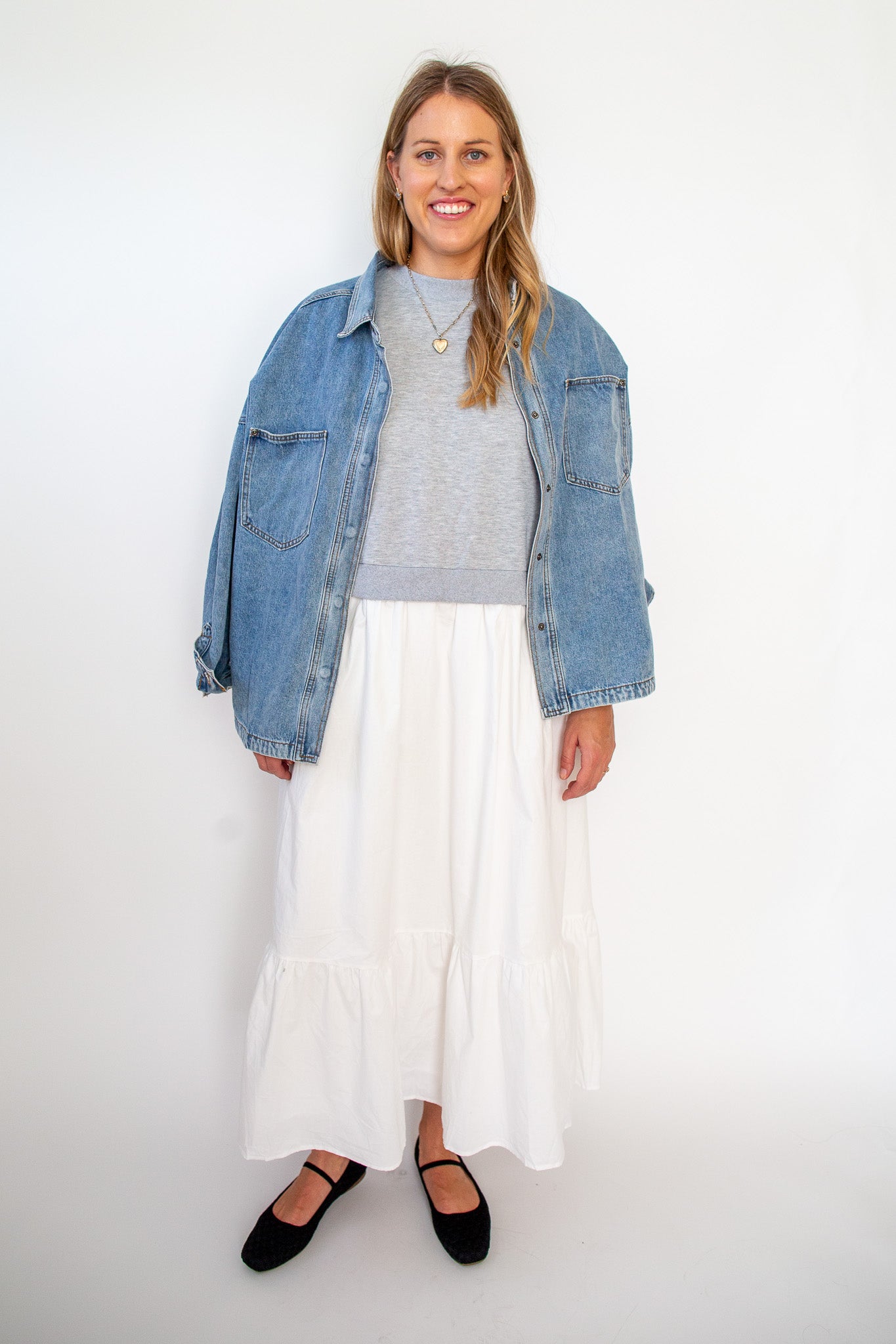 The fit is relaxed. If you are between sizes we recommend going to your smaller size. Elle is 5'10" wearing a size Medium, her true size.